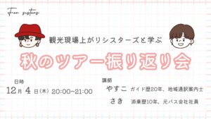 2025年12月4日(木)、通訳案内士として年間約200日稼働する長女やすこと、旅行会社社員としてこれまで年間約120日添乗員として稼働してきた四女さきで秋のツアー振り返り会を実施しました。 ガイドや添乗って現場にでたら […]